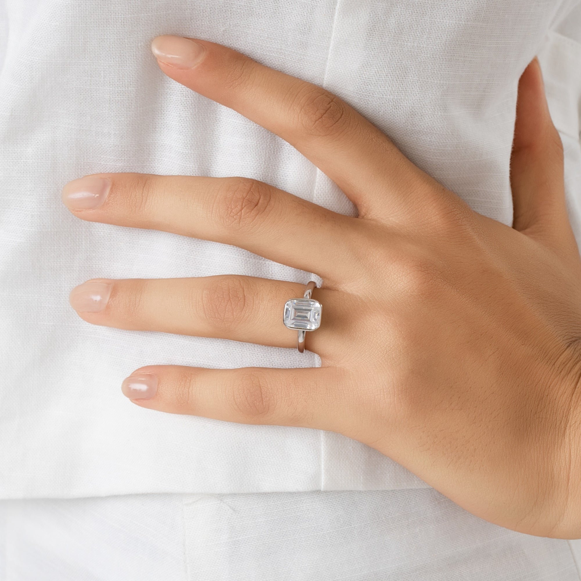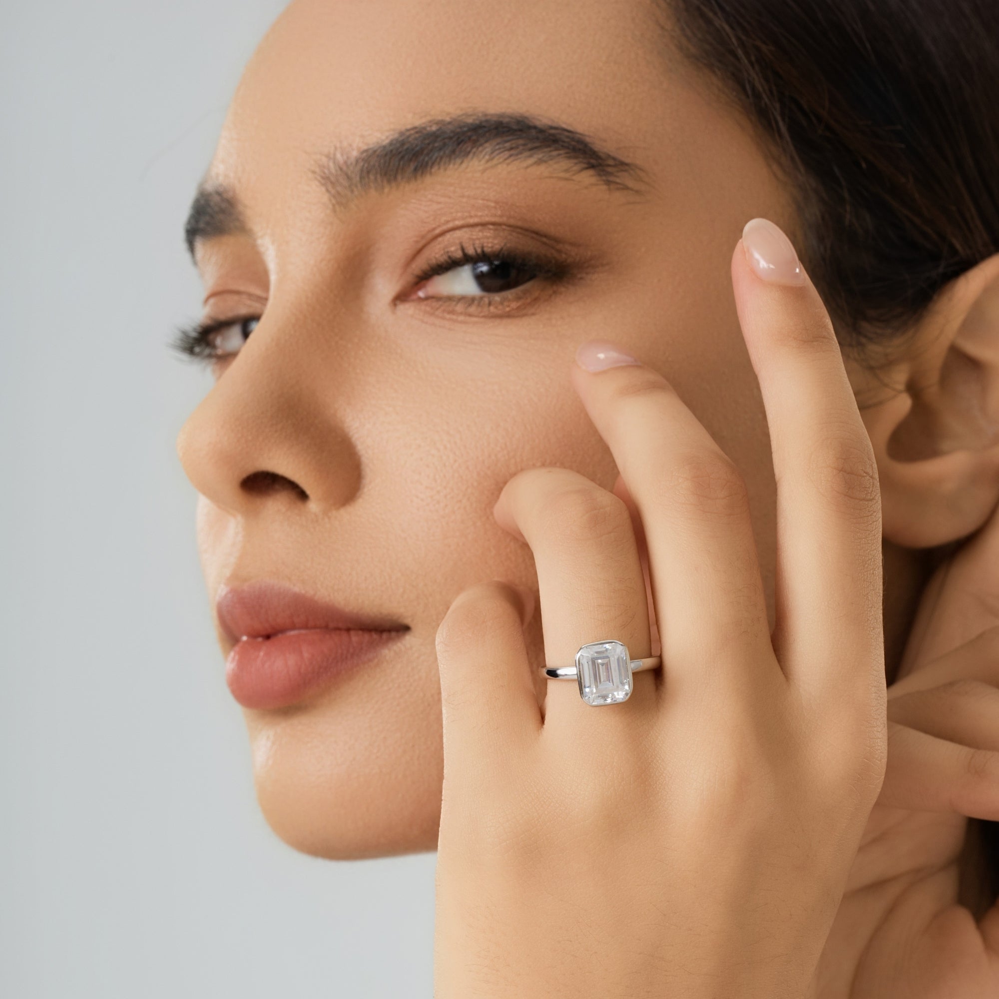 This 2.5 Carat Emerald Cut Bezel Set Solitaire Engagement Ring is designed for modern brides who appreciate refined beauty with intentional design. At its centre sits a striking emerald-cut stone, known for its architectural lines and elegant clarity, delivering a sophisticated presence that feels both contemporary and timeless.