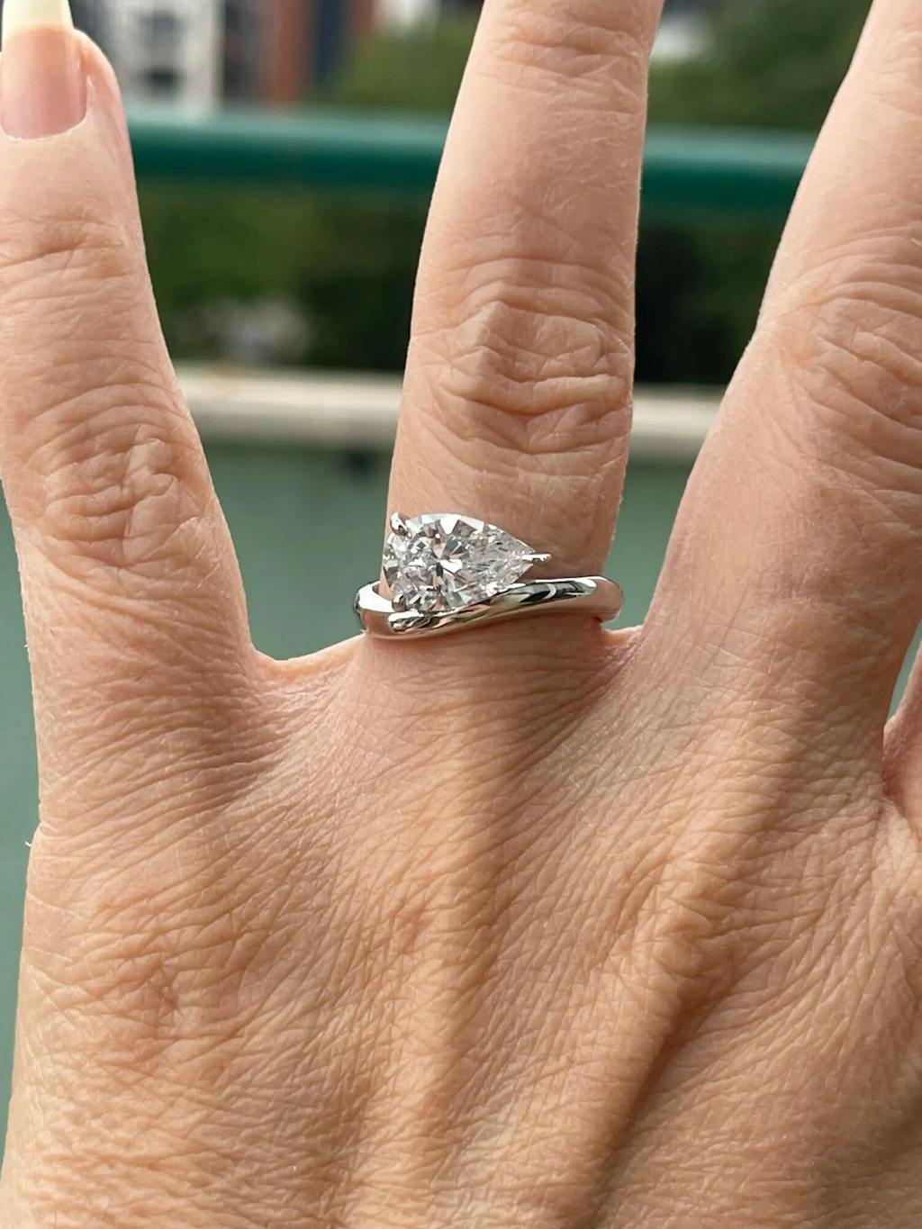 Experience the organic beauty of love with this stunning engagement ring - a true work of art. The fluid, curved band delicately embraces a 2.5 carat pear cut diamond alternative, horizontally set in an east-west orientation with a beautiful basket setting. This timeless design epitomizes modern elegance and will surely become an heirloom of your forever love. Trust us, this is a must-have for any modern bride-to-be!