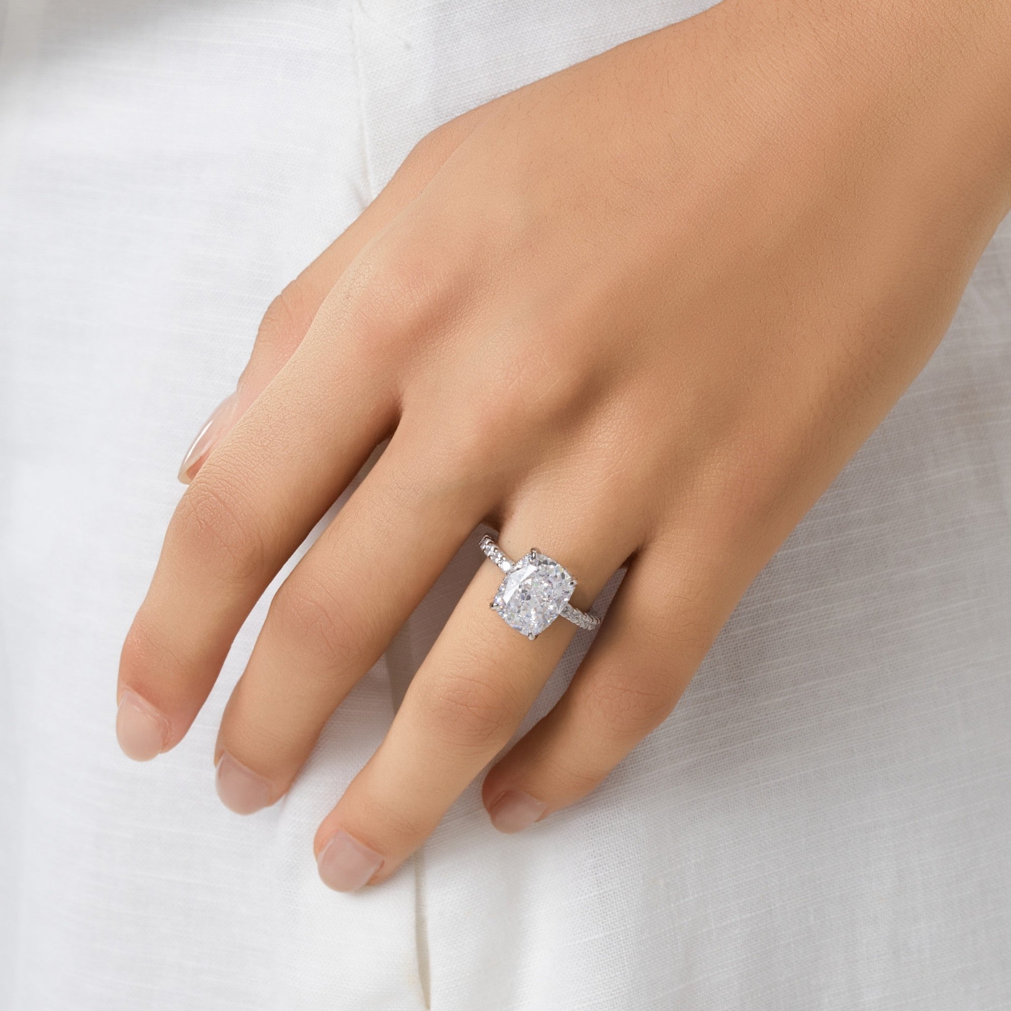 Shine from every angle with this stunning 5 Carat Elongated Cushion Cut Solitaire Hidden Halo Engagement Ring. Featuring a magnificent 5 carat elongated cushion cut simulated diamond, this diamond alternative engagement ring sparkles with exceptional brilliance and fire. The hidden halo setting, adorned with sparkling stones on the basket, adds a refined, elegant touch, while the white band is enhanced with a pavé of slightly larger round stones to intensify the sparkle and draw attention to the center gem.