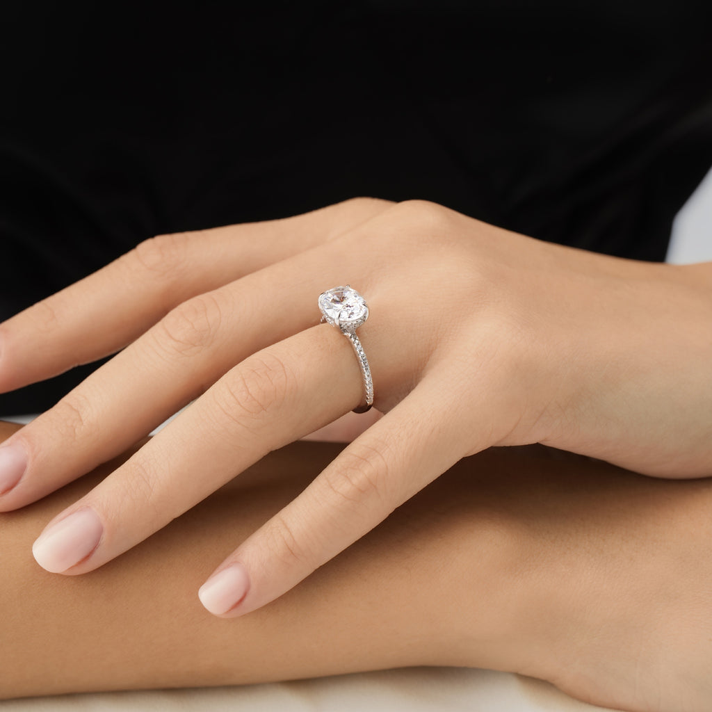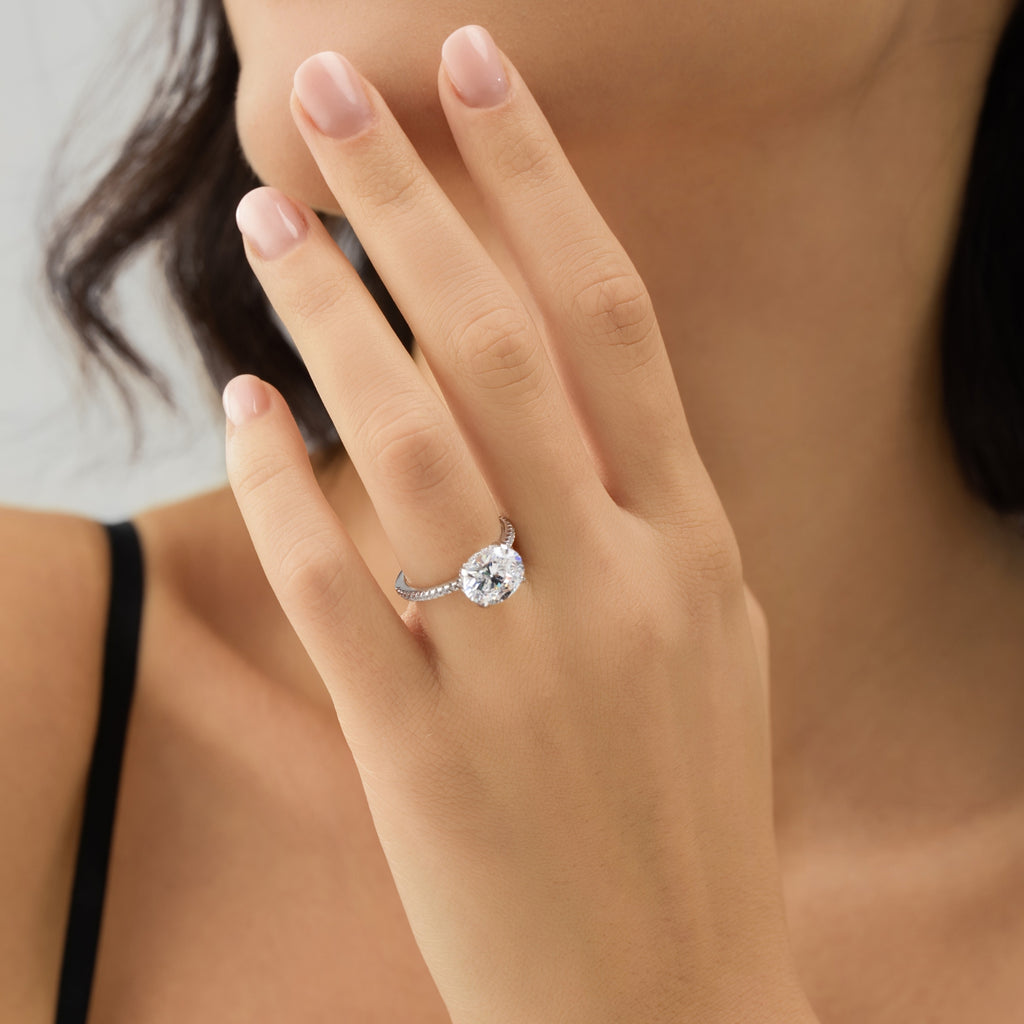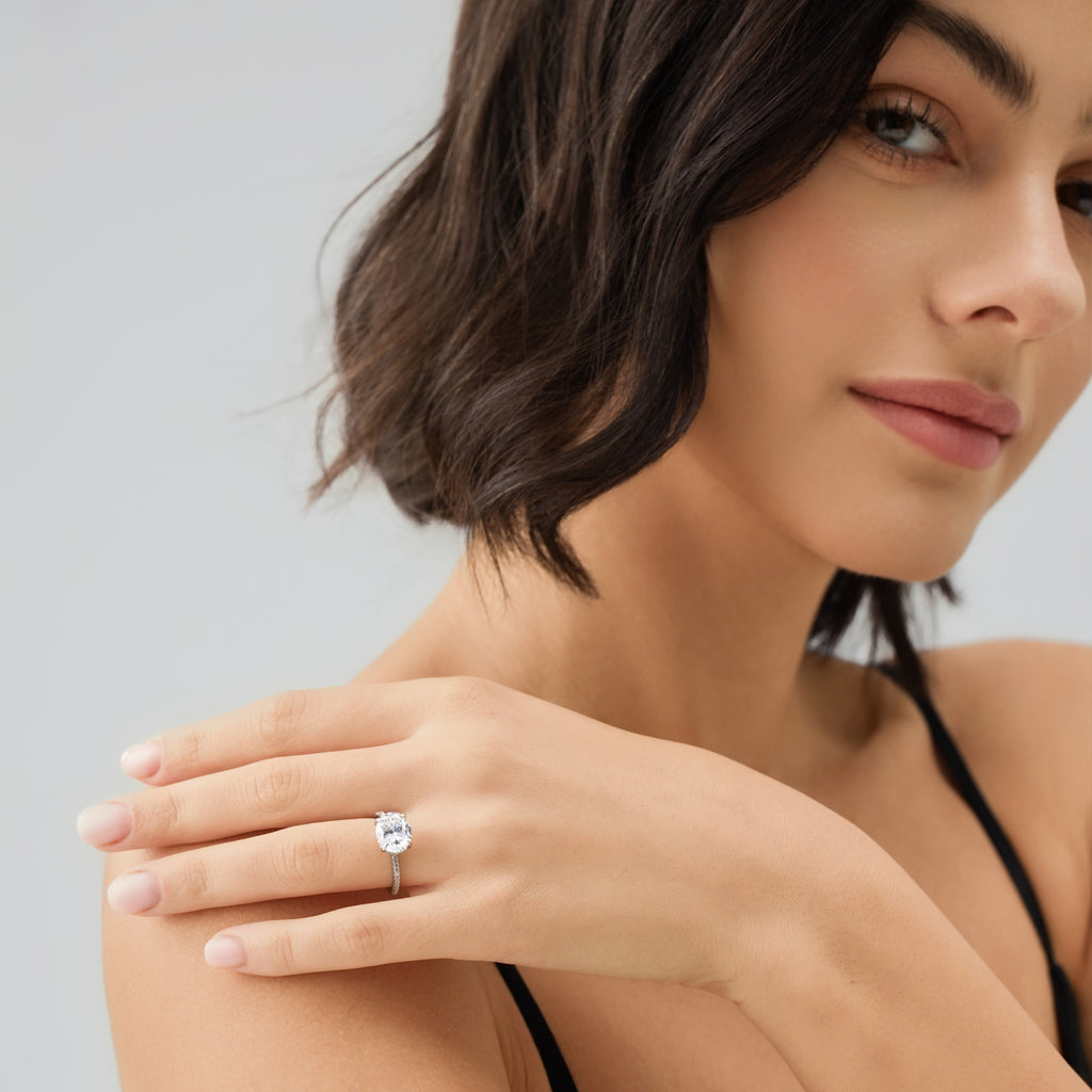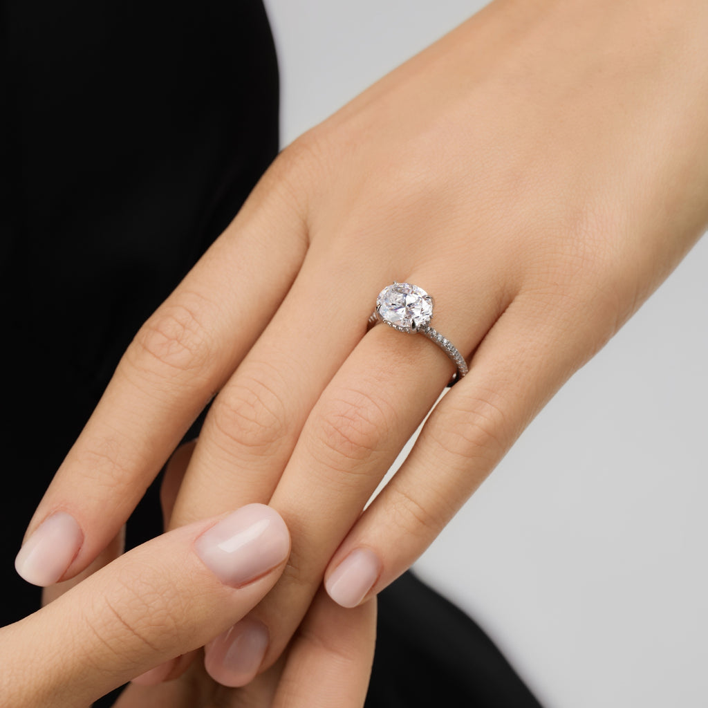 This 2.5 carat oval engagement ring is designed for trendsetters and tastemakers, adding a modern twist to a timeless classic. It showcases a stunning 2.5 carat oval simulated diamond, expertly set in an east-west orientation for optimal finger coverage. The delicate French set hidden halo adds a touch of elegance, while the pave band and four-claw prongs complete the modern look. Plus, this sterling silver engagement ring is thoughtfully designed to stack perfectly with our wedding band for a seamless and stylish combination.