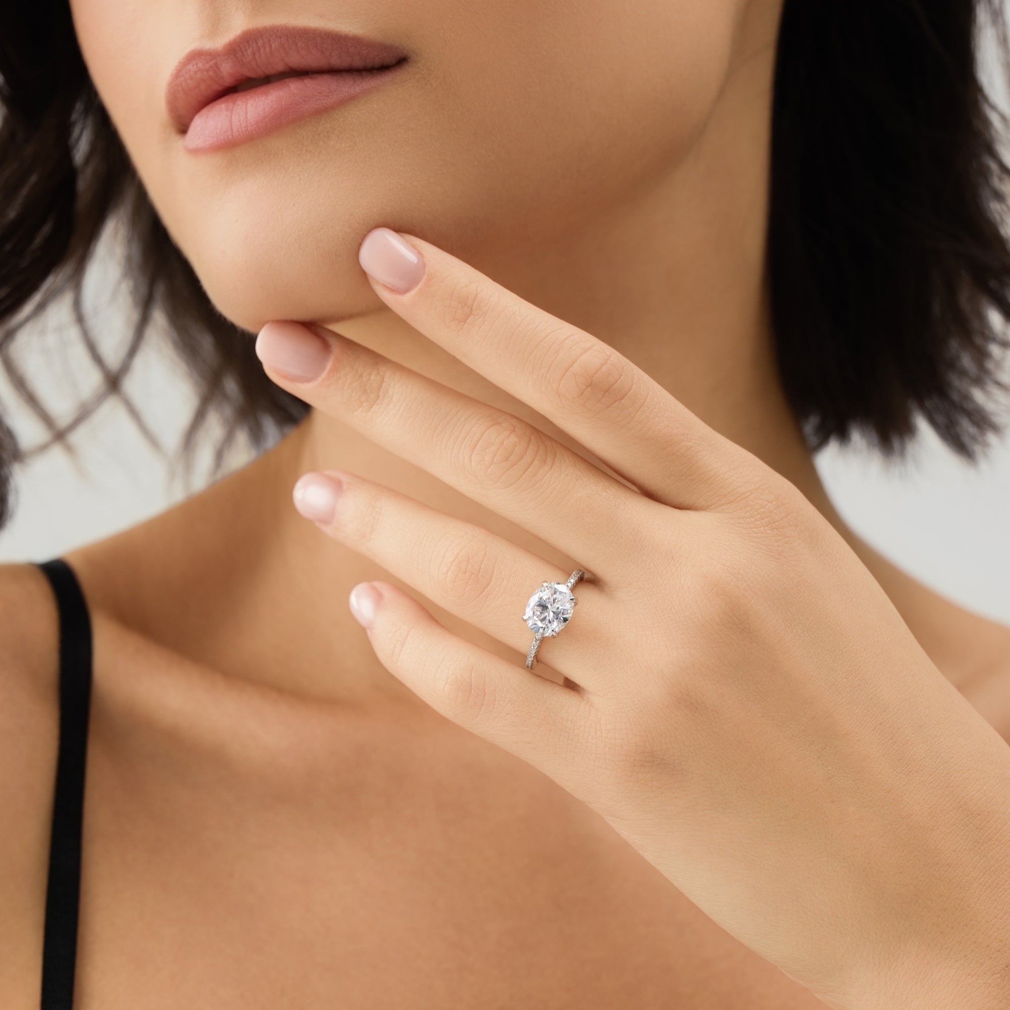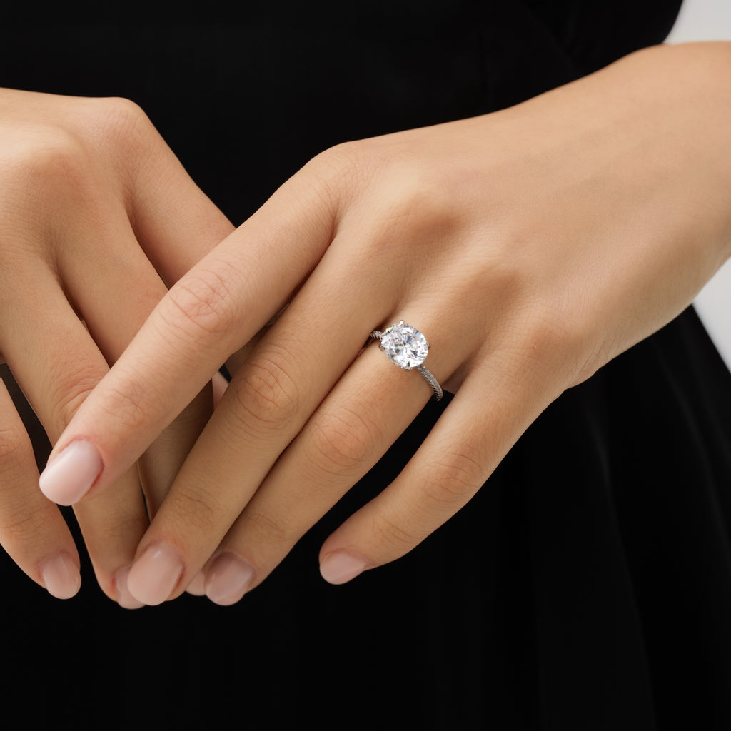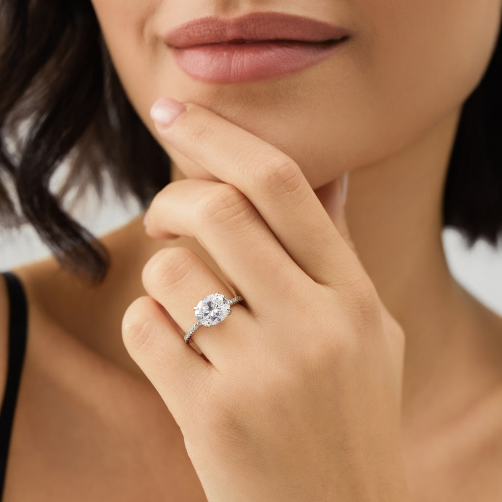 This 2.5 carat oval engagement ring is designed for trendsetters and tastemakers, adding a modern twist to a timeless classic. It showcases a stunning 2.5 carat oval simulated diamond, expertly set in an east-west orientation for optimal finger coverage. The delicate French set hidden halo adds a touch of elegance, while the pave band and four-claw prongs complete the modern look. Plus, this sterling silver engagement ring is thoughtfully designed to stack perfectly with our wedding band for a seamless and stylish combination.
