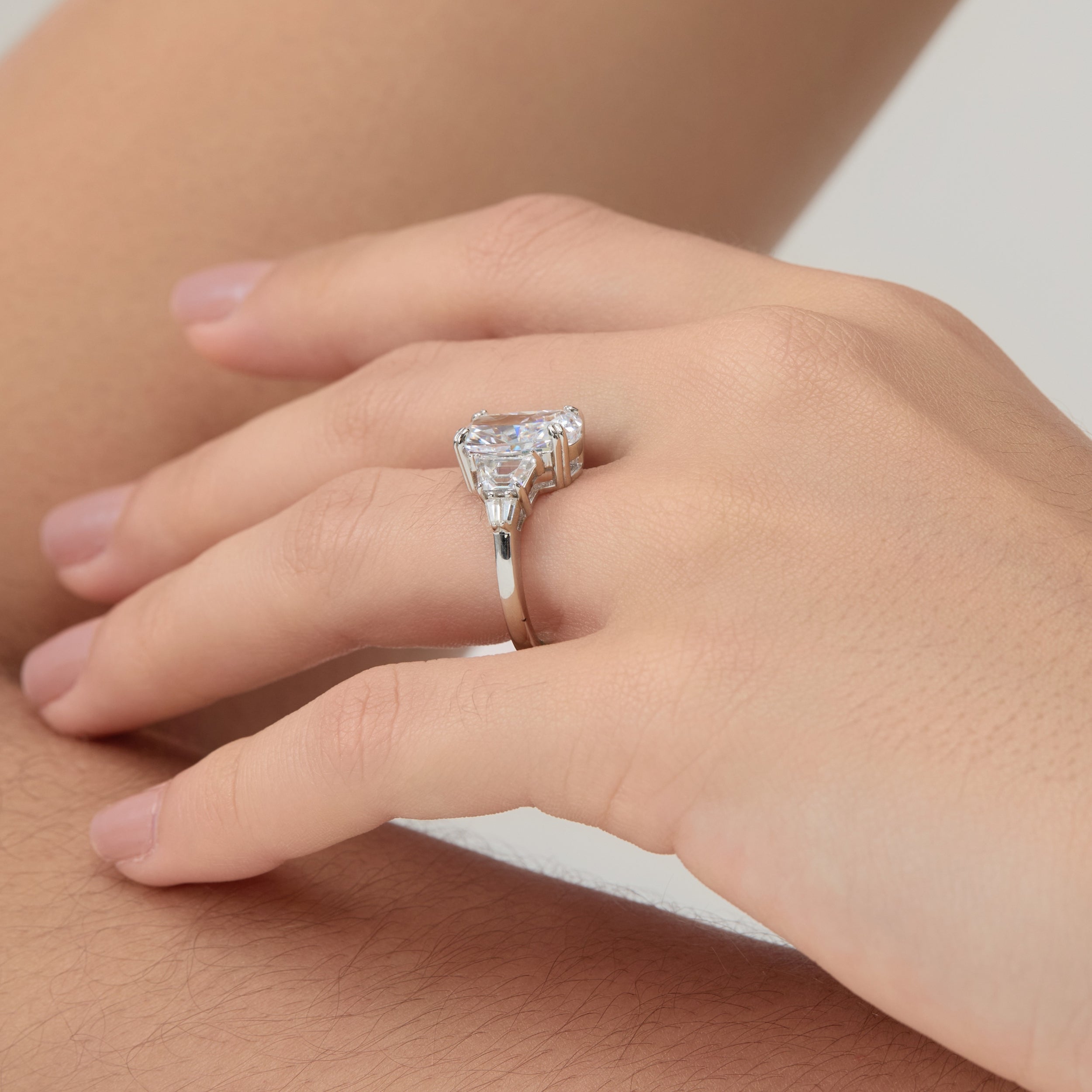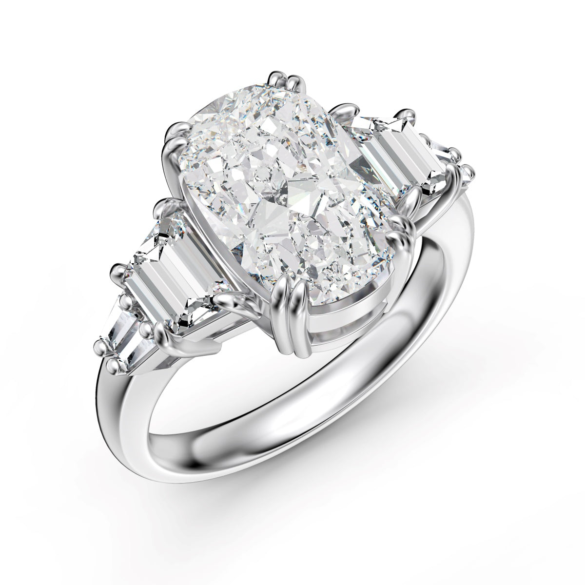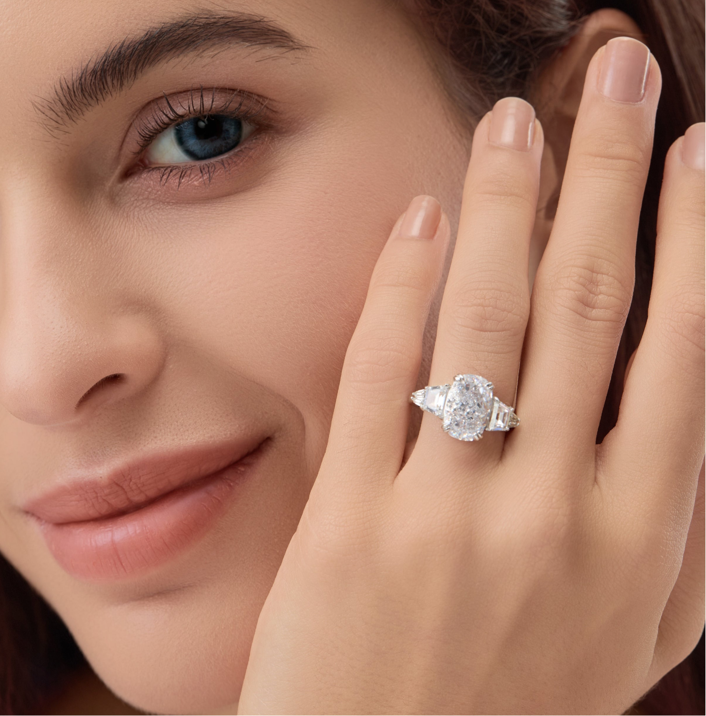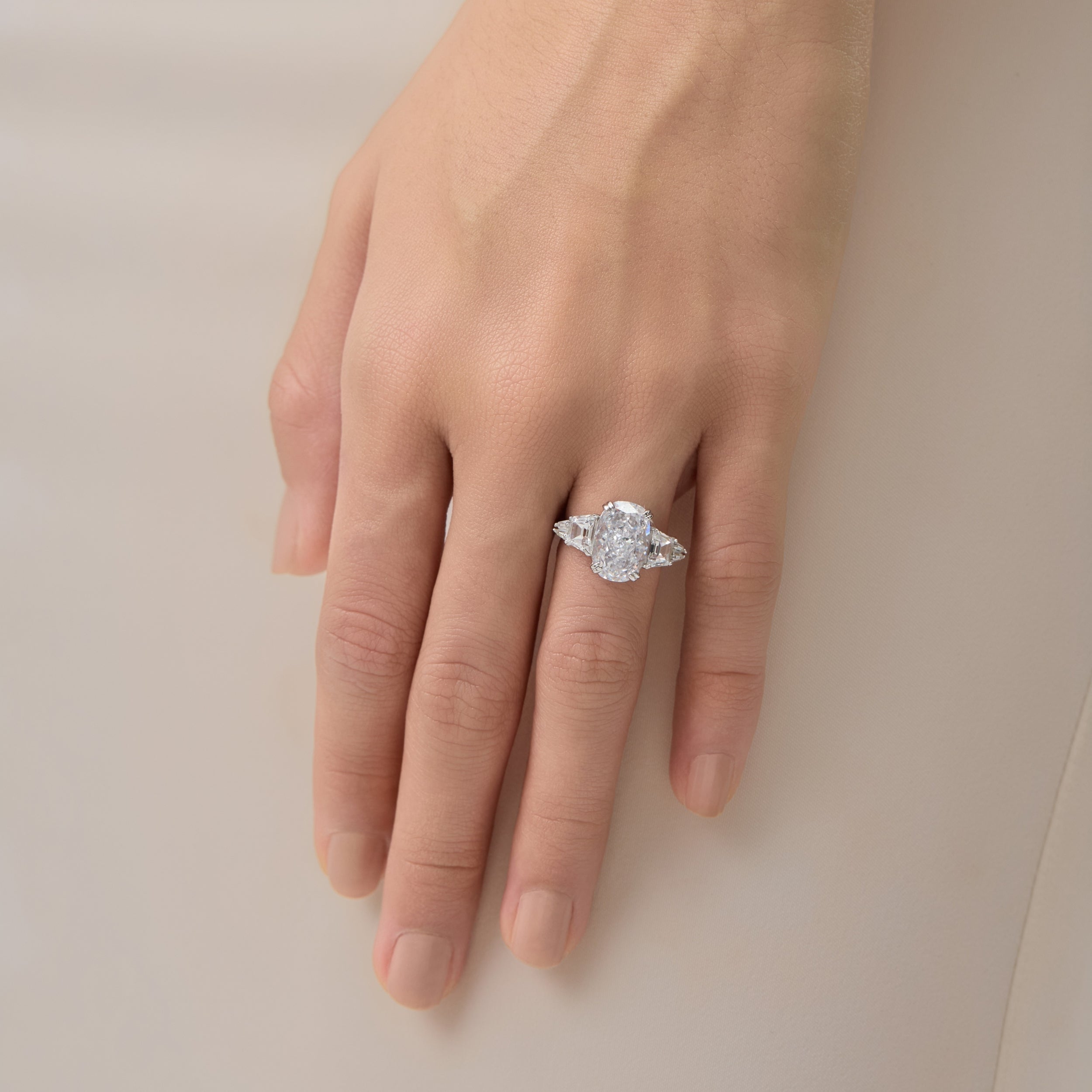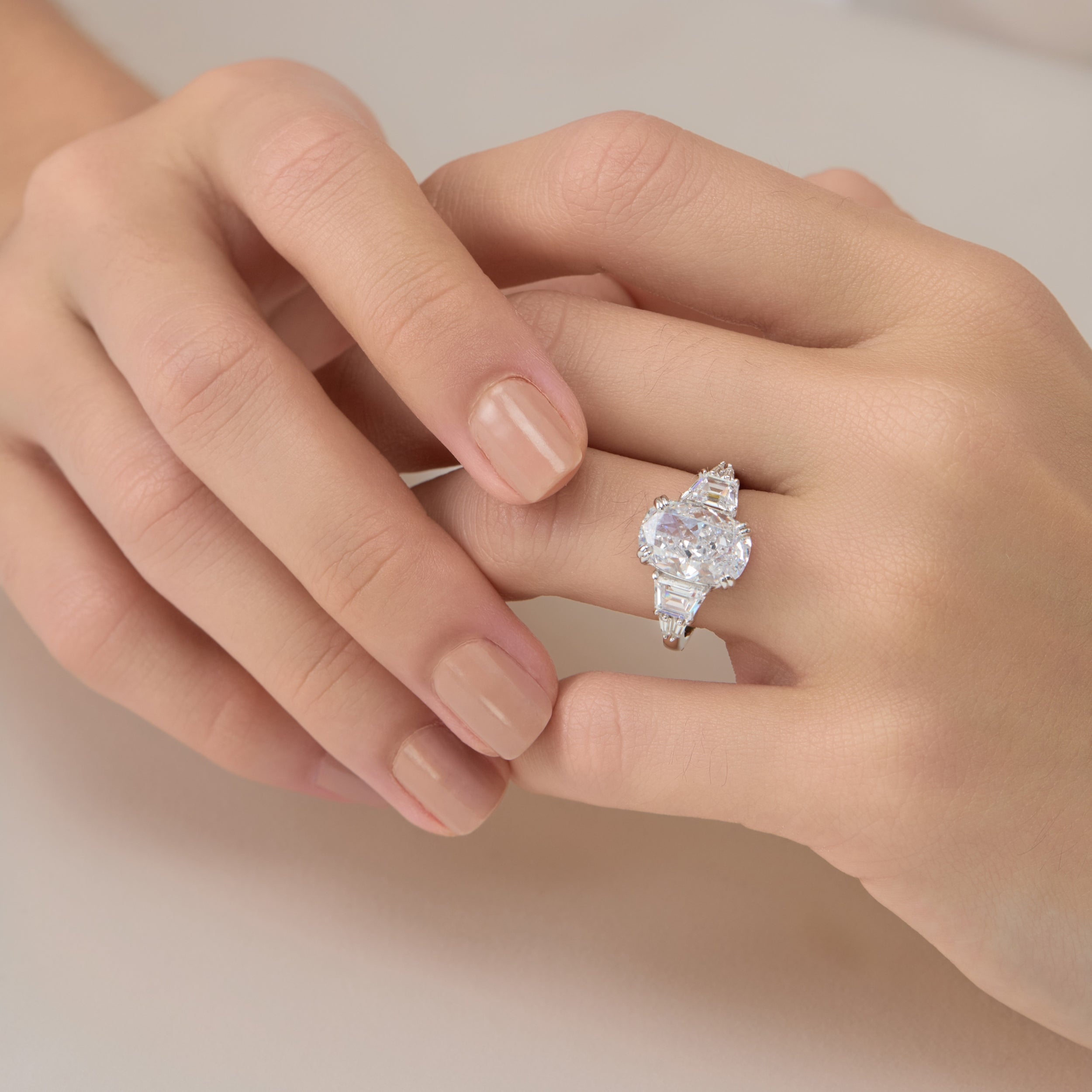 This 3.5 Carat Oval Multi-Stone Engagement Ring is a celebration of sculpted sophistication. The elongated oval centre stone delivers bold brilliance, while tapered baguette side stones create a refined, architectural silhouette. Together, they form a look that is timeless yet modern — elegant, structured, and striking from every angle.