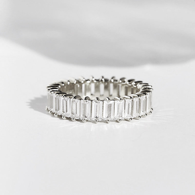 Enhance your style with the Baguette Cut Full Eternity Ring Wedding Band - Gold. This exquisite gold band features a continuous line of sleek baguette-cut simulated diamonds, combining contemporary sophistication with classic charm. Designed for everyday elegance, it serves beautifully as a wedding band or a fashionable stacker. Perfectly complementing our Emerald or Radiant Cut Engagement Rings, or stunning on its own as an eternity ring, this piece symbolizes everlasting love while adding a captivating sparkle to any moment. Make a lasting impression with this timeless and glamorous ring.