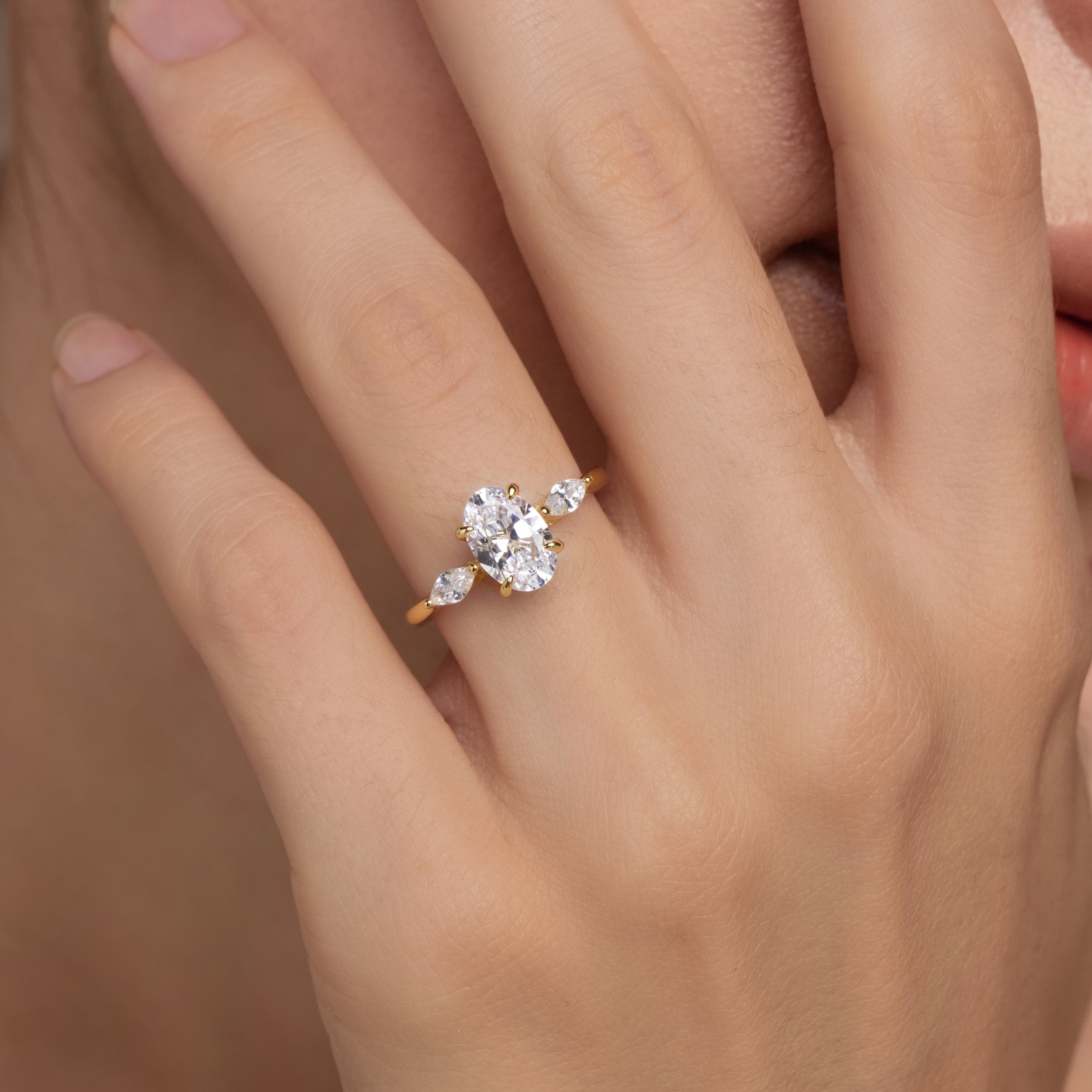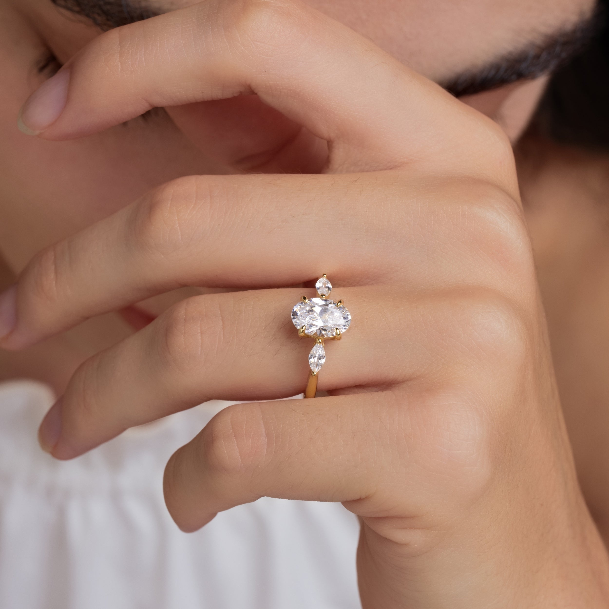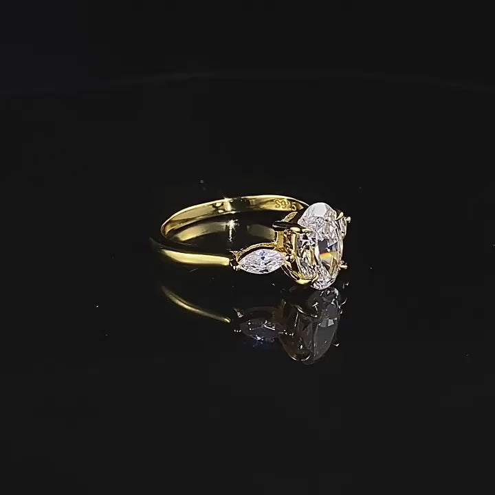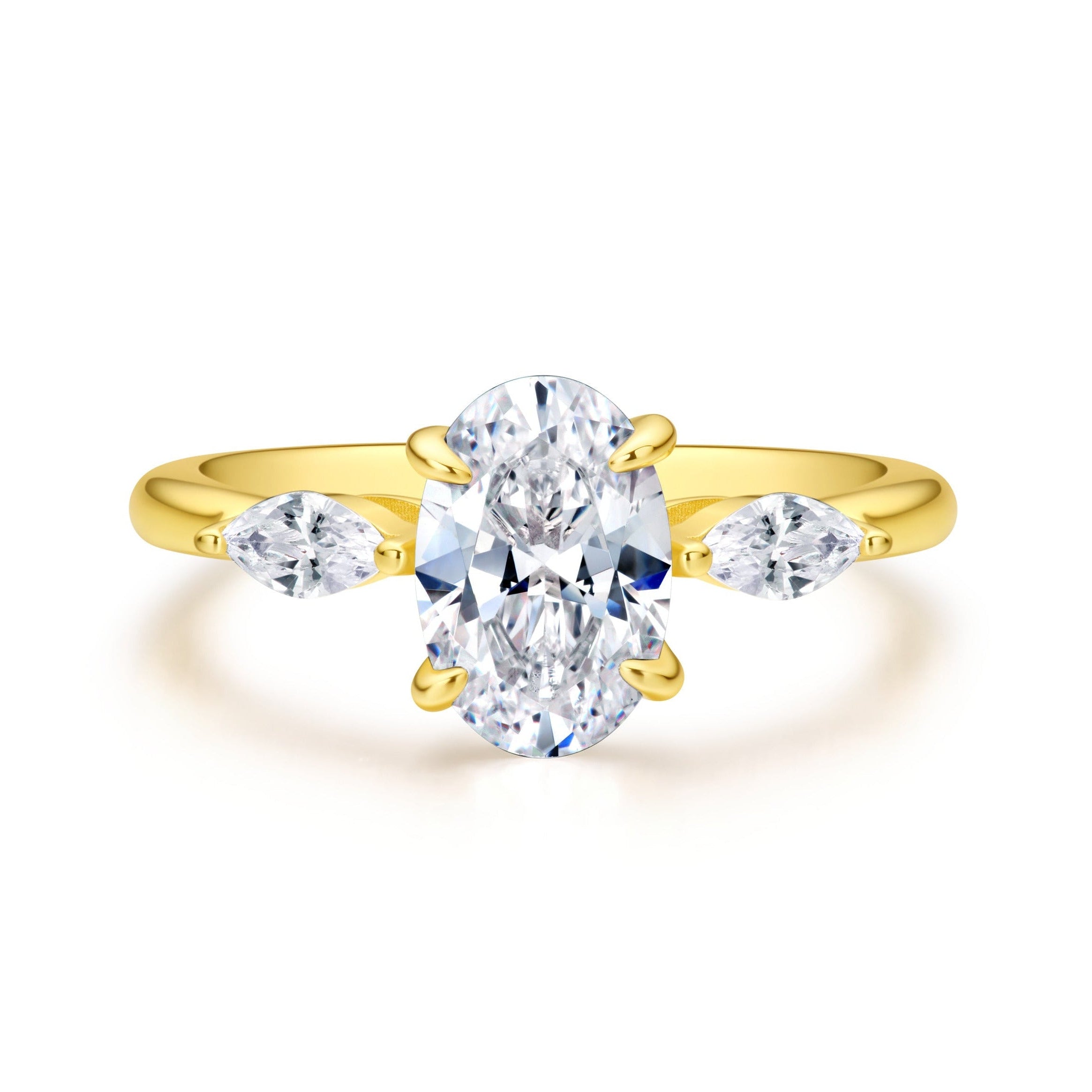 Crafted from 925 Sterling Silver and finished in 18K Gold Plating, this ring offers a warm, high-polish luxury finish. Set with premium cubic zirconia, a brilliant diamond alternative, the oval centre stone delivers striking presence, while the marquise-cut side stones add refined tapering and light-catching brilliance. A slim 2mm band and classic prong setting ensure lasting beauty and everyday comfort.