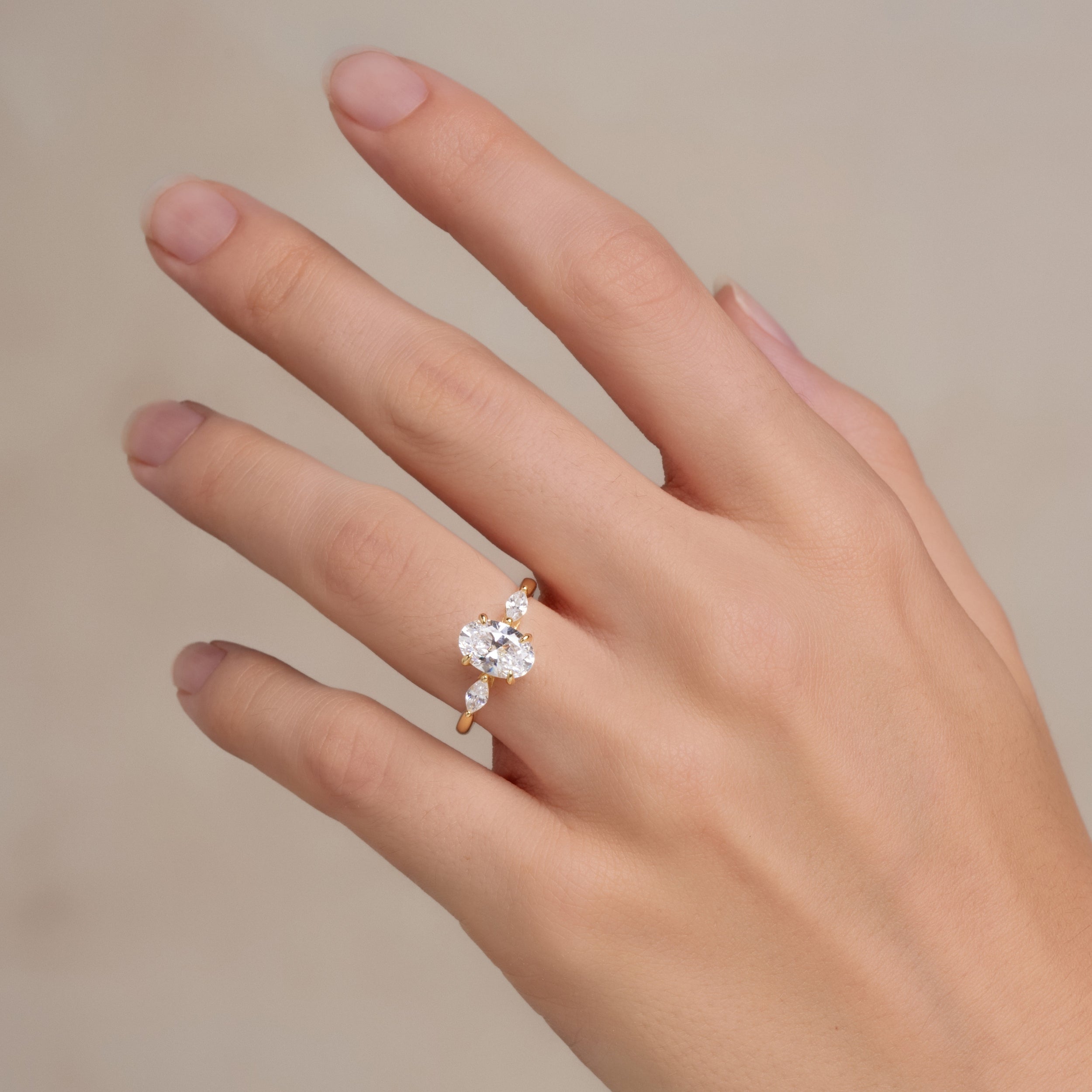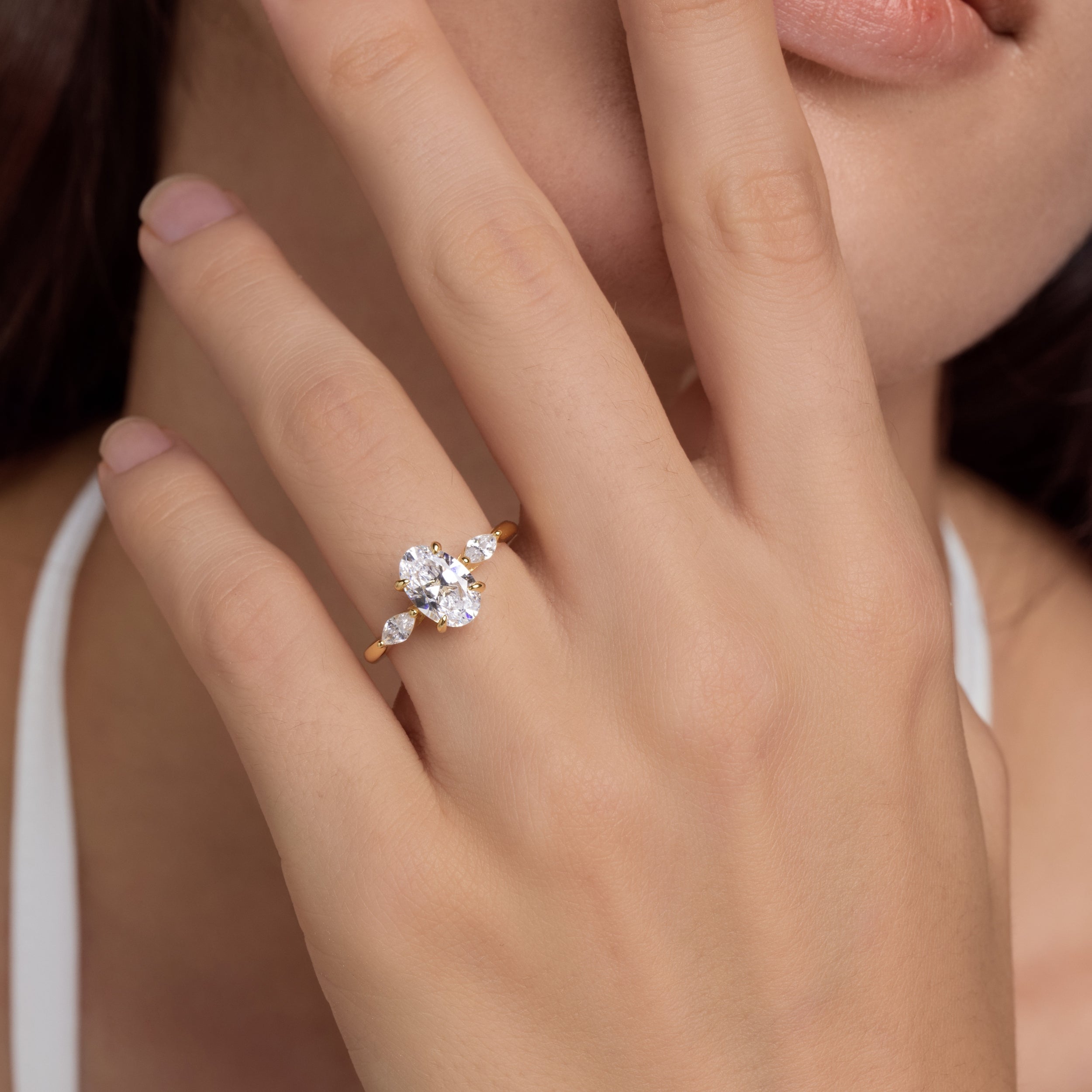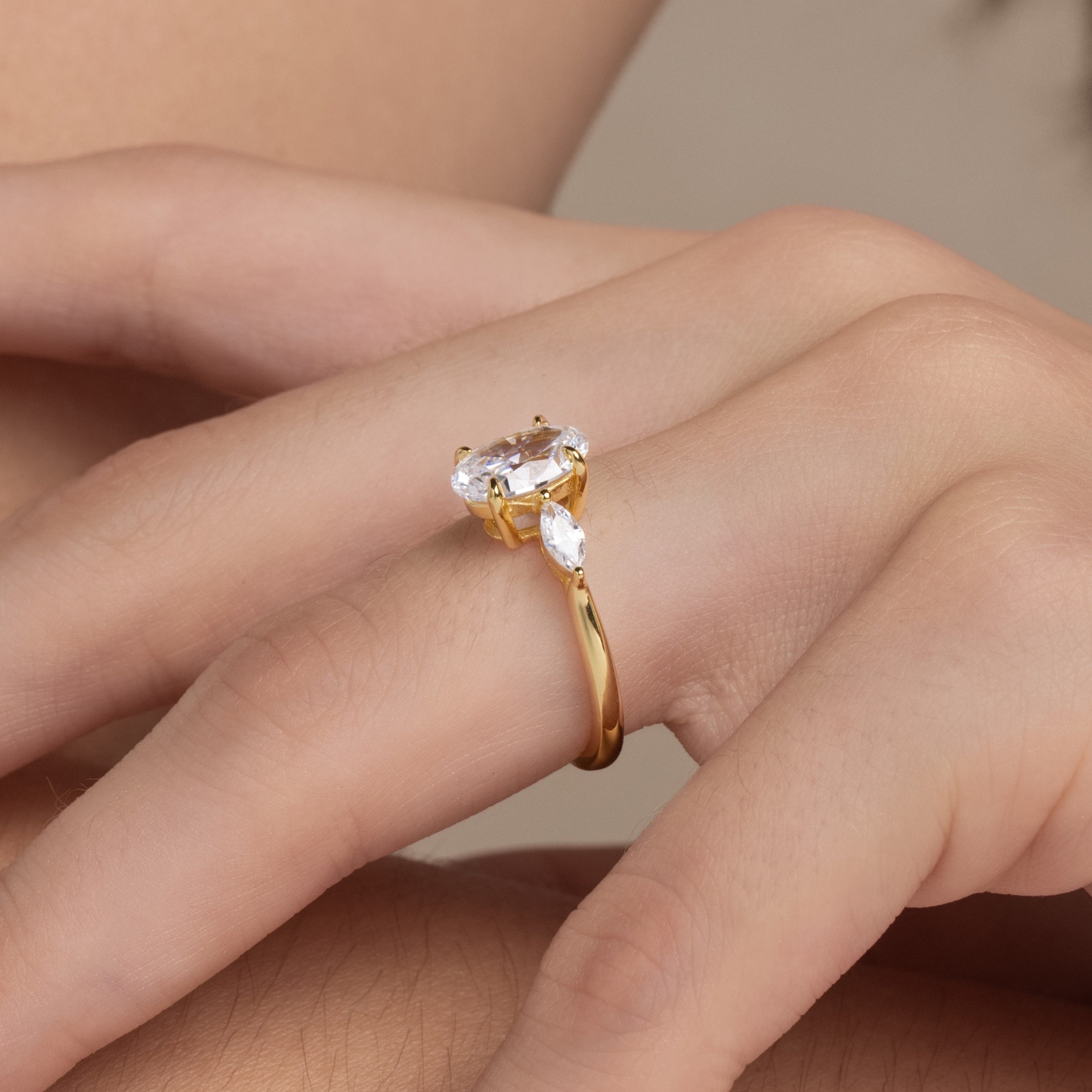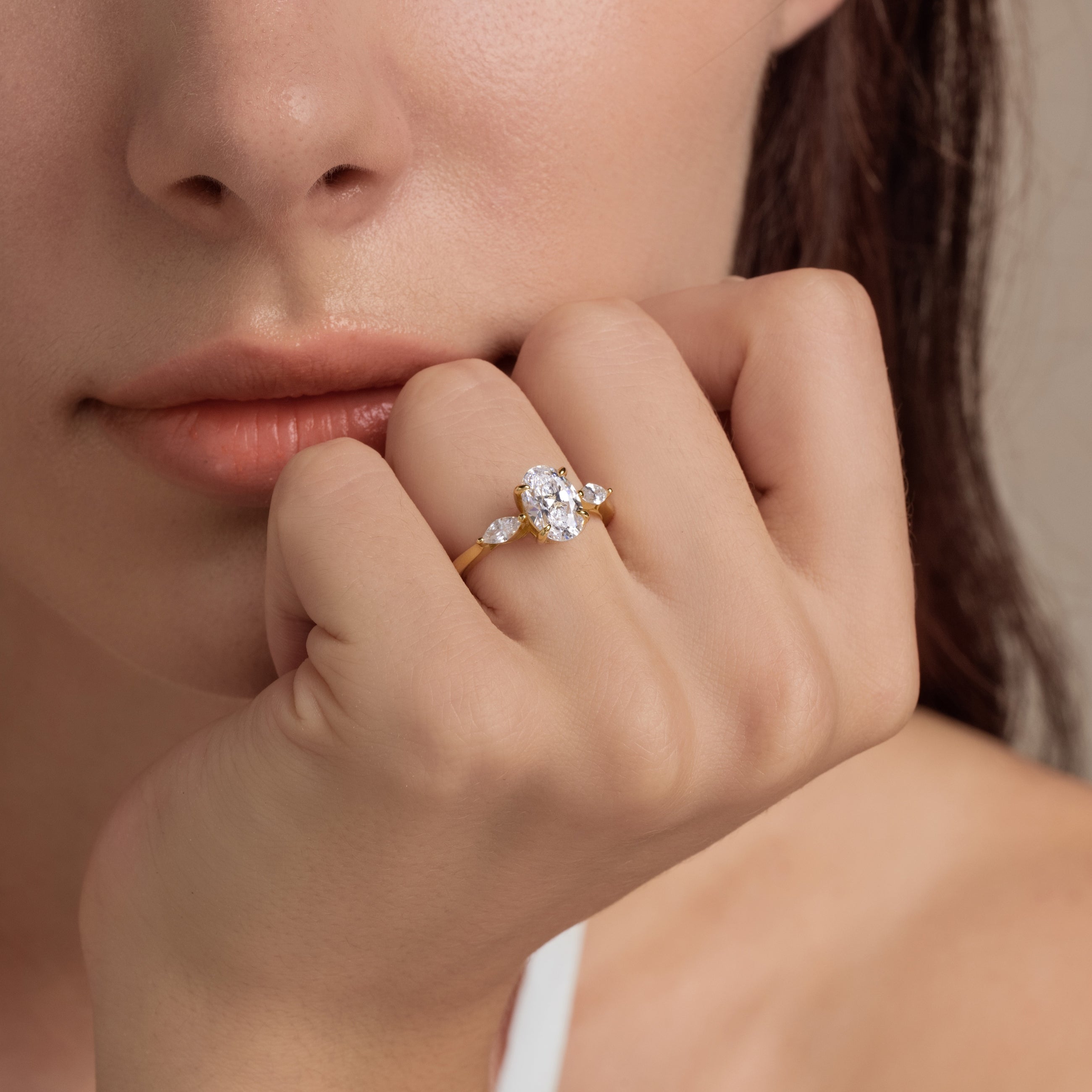 Crafted from 925 Sterling Silver and finished in 18K Gold Plating, this ring offers a warm, high-polish luxury finish. Set with premium cubic zirconia, a brilliant diamond alternative, the oval centre stone delivers striking presence, while the marquise-cut side stones add refined tapering and light-catching brilliance. A slim 2mm band and classic prong setting ensure lasting beauty and everyday comfort.