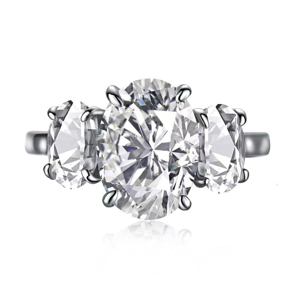 Introducing our 4 Carat TW Oval Cut Three Stone Engagement Ring—a timeless symbol of love and commitment. Crafted for the modern bride-to-be, this ring offers a traditional "Past, Present, and Future" design that never goes out of style. Stunningly crafted from sterling silver, it features a 3-carat brilliant oval-cut cubic zirconia at the center, symbolizing the present, flanked by two matching oval-shaped stones representing the past and future in a classic trinity layout.