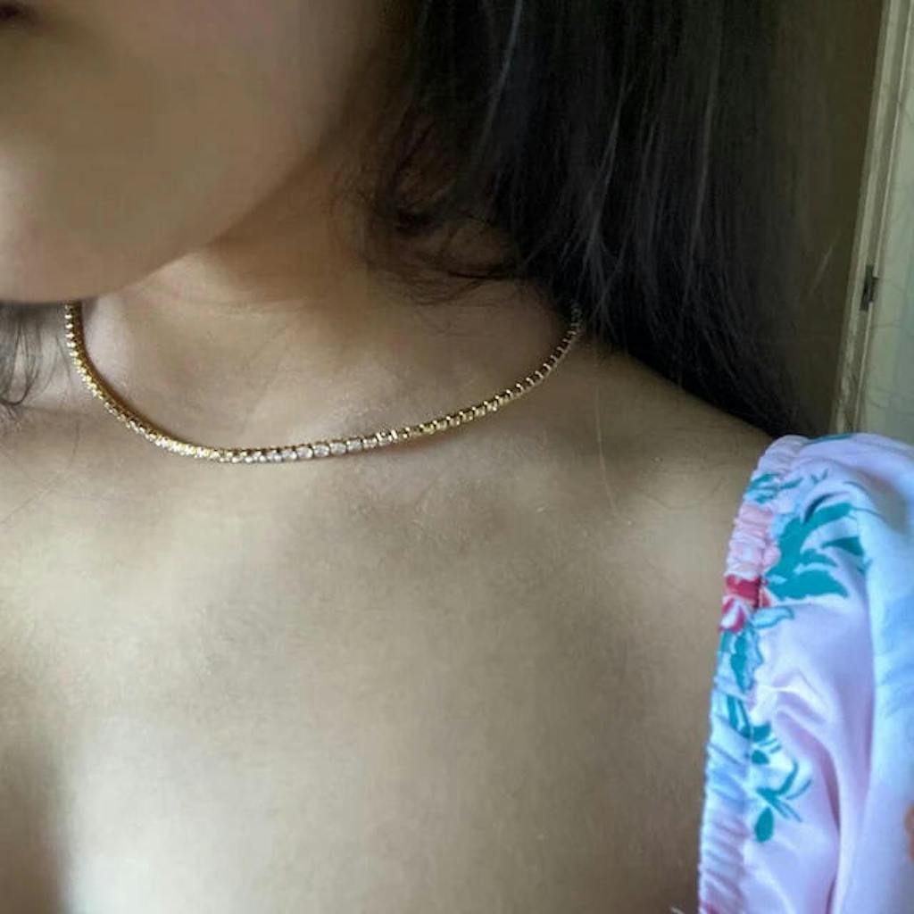 Featuring a classic cup chain design adorned with glimmering round cubic zirconias, this necklace sparkles from every angle, adding a touch of elegance to your look. This versatile gold necklace complements any outfit, from casual daywear to elegant evening attire.